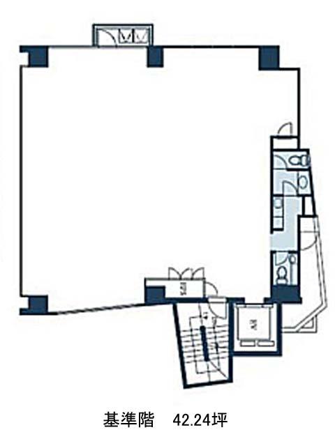 基準階42.24坪は、ほぼ整形に近い無柱空間で、レイアウト設計の幅が広がる実用的なオフィス空間です。