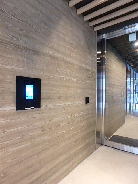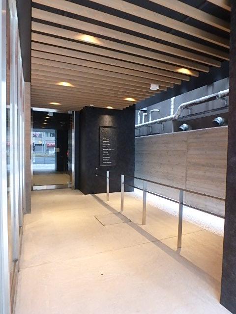 ビルエントランスは木目調と黒を基調とした洗練された空間で、企業イメージを引き上げるデザイン性も魅力です。