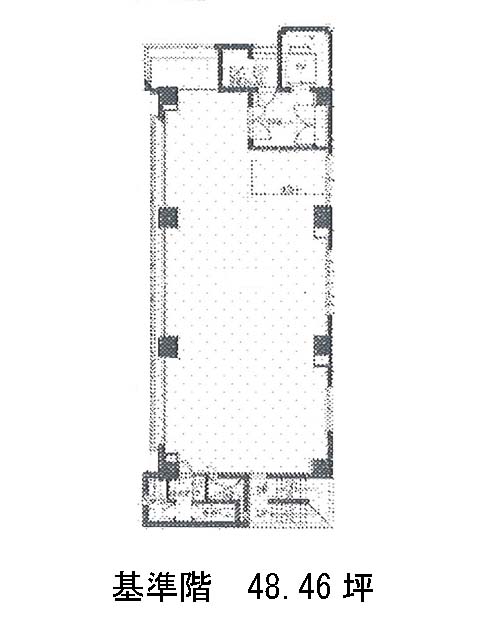 基準階は48.46坪の整形区画で、使い勝手の良いレイアウトが可能です。無柱に近い構造のため、デスク配置や会議室の設置なども柔軟に対応可能。