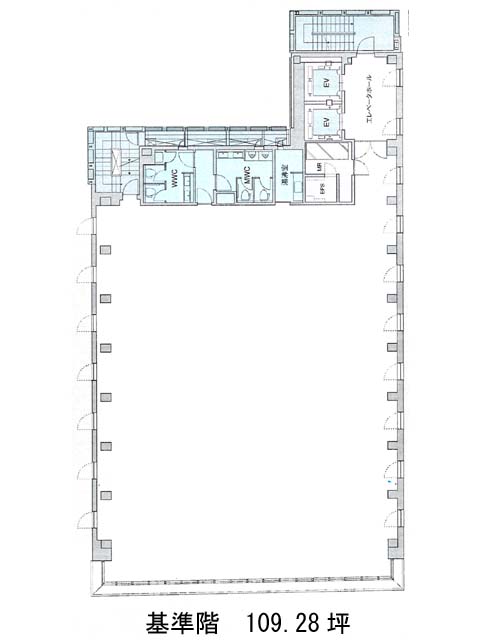 基準階は109.28坪。ほぼ整形なレイアウトで、オフィス設計の自由度が高く、多様な業種・ワークスタイルに対応可能です。