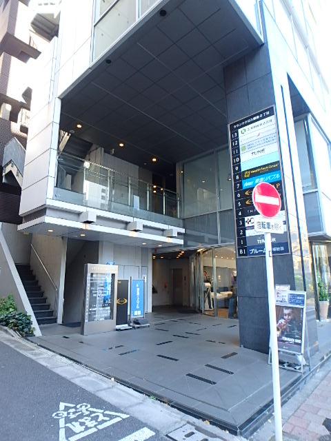 御成門駅出口すぐ、御成門交差点角地に立つ菱進御成門ビル。2015年竣工の外観はガラスウォールと洗練されたマテリアルで構成されており、通りに映える存在感があります。
