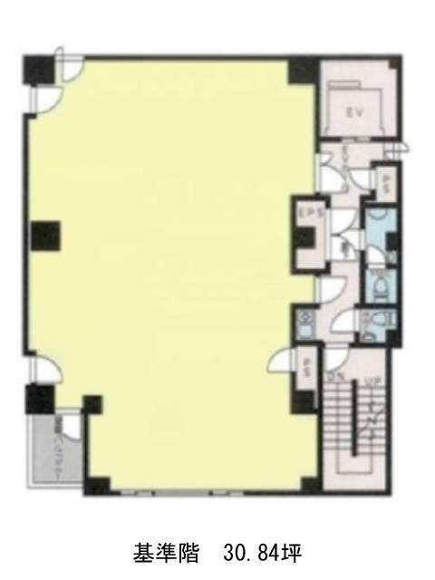 基準階は30.84坪のコンパクトオフィス。整形に近い間取りでレイアウト効率が高く、少人数から中規模チームまで柔軟に対応可能。