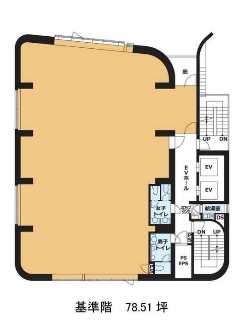 基準階約79坪の区画は、柔らかなカーブを描く個性的な外形ながらも、執務エリアは比較的整形で、レイアウトも組みやすい構成です。