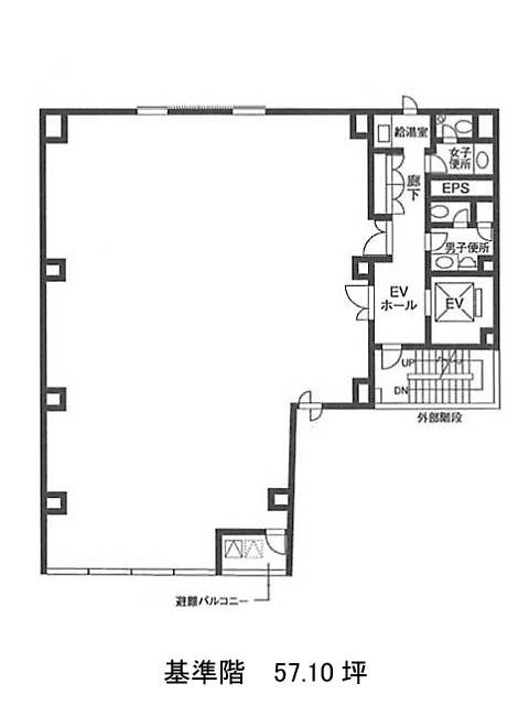 基準階は57.10坪。執務スペースはL字型構成で、レイアウト効率の良さが期待できる区画です。水回り(男女別トイレ・給湯室)は室外共用部に集約されており、執務エリアとの分離が明確。
